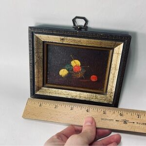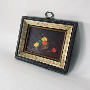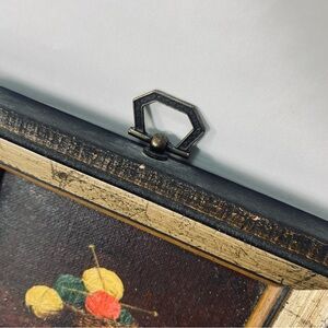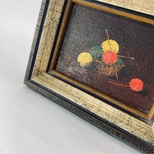 This is a beautiful miniature vintage still alive oil painting on board of a basket, yarn, and knitting needles. Nice vintage style and cute miniature frame.