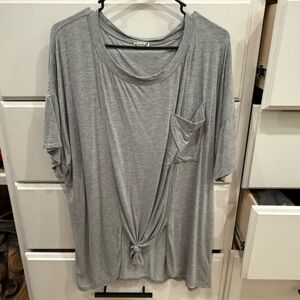Casual light gray tee with a stylish front knot. Features a convenient chest pocket. Ideal for relaxed outings.
