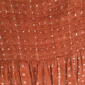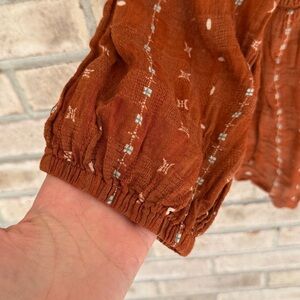 Charming terracotta blouse with smocked bodice. Features delicate patterns and three-quarter sleeves. Ideal for casual elegance.