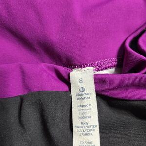 Dynamic leggings with bold abstract design. Features purple, gray, and white hues. Ideal for workouts.