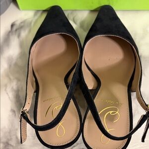 Chic black slingback heels with a pointed toe. Perfect for elevating any outfit. Beautiful shoe that has maybe been worn two times. Comes with dust bags and box. ( box does have damage). Please see photos they are part of the description