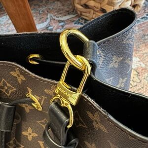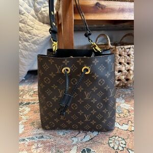 Good condition, but top trim is peeling off. See photos 4 and 5. LV inspired dupe bucket bag Neonoe style. Brown and black.