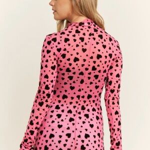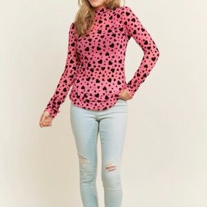 Add a touch of fun to your wardrobe with this stylish pink long sleeve top, featuring a charming black heart pattern. Ideal for any casual occasion.