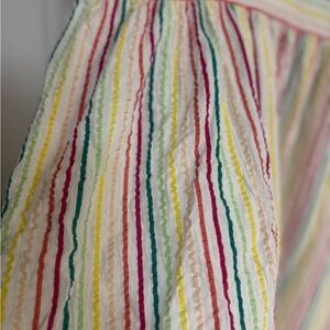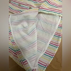 Add a pop of color to your wardrobe with this charming rainbow-striped midi dress by LOFT! Features a flattering V-neckline, flutter sleeves, full button front, and a cinched waist that originally included a removable belt (belt is not included).