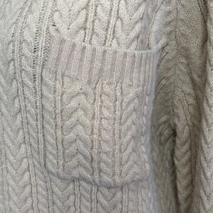 Cozy cream cable knit sweater with a classic design. Features a stylish pocket detail.