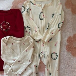 Adorable set of baby onesies. Includes a red onesie with a cute design and two cream onesies with festive patterns. Perfect for the holiday season. Size 0-3 washed never worn.