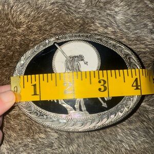 Oval silver belt buckle with a black background and a western horse design.