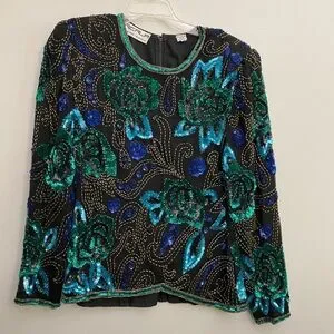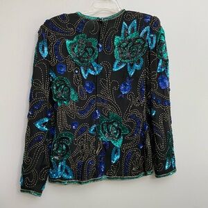 Vintage Beaded Silk Shirt in really good condition. Scala brand shirt with gorgeous floral and paisley beadwork all over. This is a heavy piece, extremely high quality. Zipper on the back of neck.