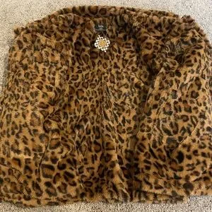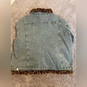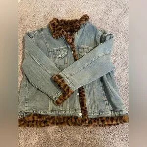 Stylish jean jacket with leopard print trim. Features a playful yellow patch on the sleeve. Perfect for a bold look. NWT