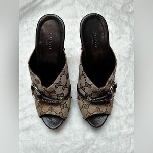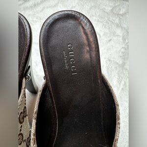 Elegant Gucci mules with signature monogram pattern. Stylish brown leather accents. Perfect for elevating any outfit. 100% Authentic - 100% Positive Feedback -