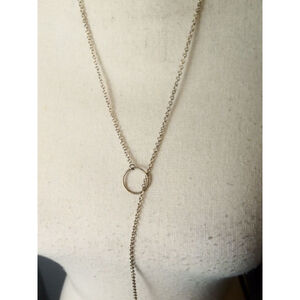 This is a pre-owned, gold-toned lariat necklace featuring a delicate chain. The necklace has a circular connector from which a longer chain descends, terminating in a small, detailed wing charm. The necklace measures approximately 16 inches in total length. No brand markings are visible.