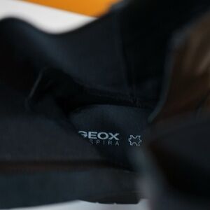 Chic black leather booties by Geox. Sleek design with a comfortable fit. Ideal for versatile styling.
