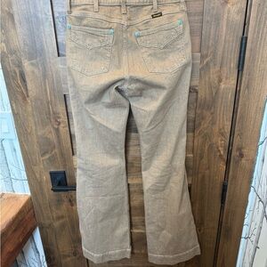 Stylish Wrangler Brown Jeans w/ turquoise jewel buttons on pockets. Ideal for everyday wear.