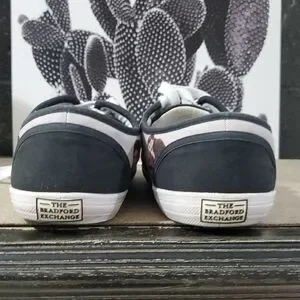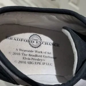 Stylish sneakers featuring Elvis Presley design. Black and white color scheme. king of rock, Bradford exchange wearable art, 2016 laces