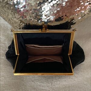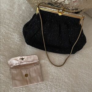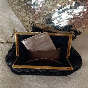 This elegant black evening clutch is perfect for any special occasion. Its sleek design and shimmering micro beads and mother of pearl details add a touch of sophistication to your ensemble.It comes with coin purse fitted perfectly to one of its packets. Measurements are 7.5”x5”top 4.5”. Rare find , great buy🌸