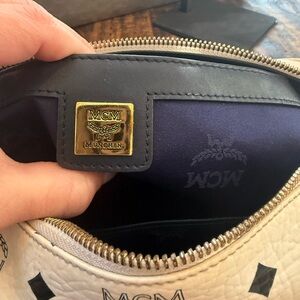 MCM Visetos Boston bag. Has navy accents and such a cute subtle statement piece. MCM logo throughout the bag. No big call outs outside of minor signs of use. Handles are good, feet intact, interior is clean. Minor signs of wear with light fading on the hardware and leather. Overall very good condition!
