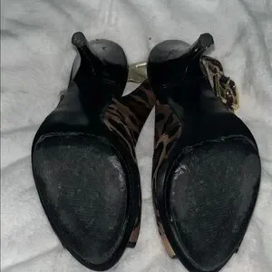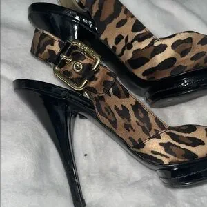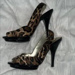 Stylish animal print with glossy black heels. Slingback strap for secure fit. Ideal for evening wear.