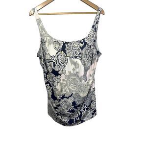 One piece. Tankini style. Round neckline. Tank straps. Low back. Soft cup bra. Built-in bottoms. Modest coverage. Light pink with blue and yellow floral paisley. Stretch material. Two in one. Swim. Beach. Poolside. Travel. Vacation. Resort wear. I