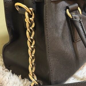 Michael Kors Hamilton leather satchel in black with gold-tone hardware.