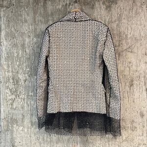 Ahigh-fashion collector's piece that beautifully blends avant-garde construction with a soft, neutral palette. It features intricate mesh paneling paired with luxurious velvet for a striking play on texture and transparency.