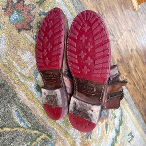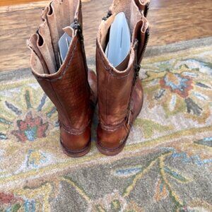 BED STU Hustle Distressed Leather Mid Calf Boot. Excellent condition. Adjustable buckle. Approx 10" shaft. 3 zippers (2 on outside, 1 inner), 1" heel height. Color has various shades of brown. Size 8.5