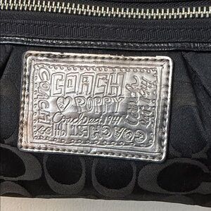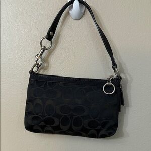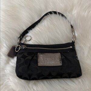 Chic Coach wristlet in black with silver accents. Features signature logo and zip closure. Ideal for essentials.