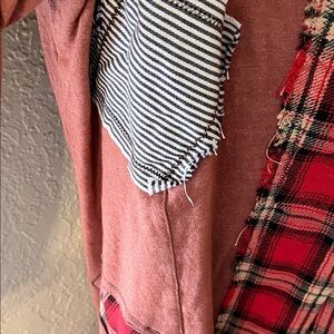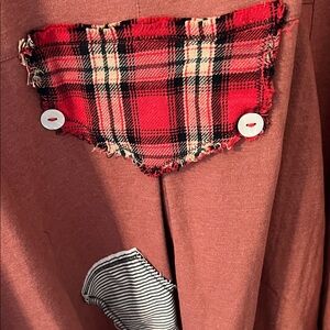 Stylish tunic with red plaid accents and button-up front. Features a unique patch detail. Fall in love with this jacket! Light weight and perfect dressed up or down. In excellent condition!