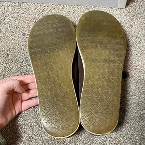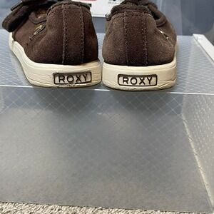 Brown Roxy slip-on loafers with iconic heart charm logo
