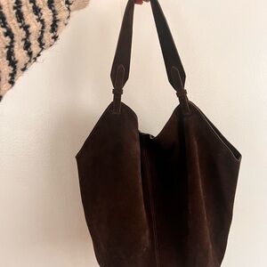 Very lightly used dark chocolate brown suede bag. Slouchy style while still looking elegant and minimal. Unbranded.