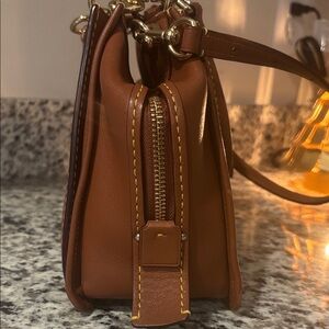 Beautiful pre-owned, authentic Coach bag with tote handles and optional cross-body strap. Lots of room on the inside, with two pockets, one that zippers. Some minor marks on one side of exterior (shown in photos). In great condition! You deserve this bag!