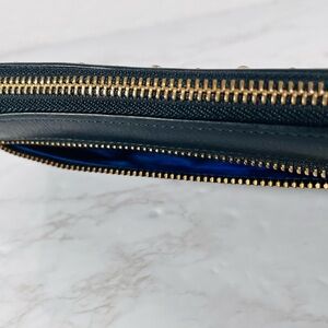 Faux leather black wallet with gold studs and a blueish purple interior. Features Juicy Couture emblem.