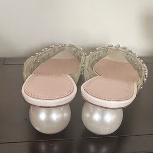 Chic clear mules with pearl embellishments. Stylish round heel. Ideal for a fashionable touch.