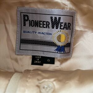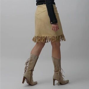 Vintage leather skirt from Pioneer Wear. Soft tan leather with fringed bottom edge. Concho buttons down the front. Nearly new condition. Size 6. Model photos are provided for style reference only.