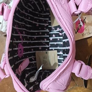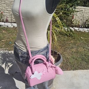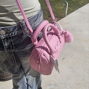 BETSEY JOHNSON PINK EMBOSSED BUTTERFLY BARREL CROSSBODY w/FLUFFY HEART TASSEL
