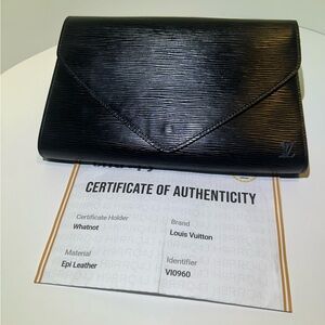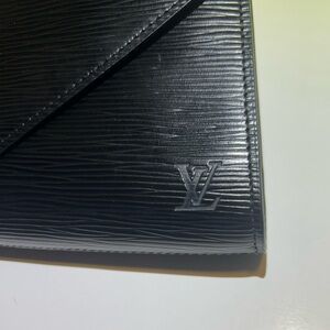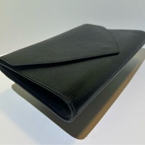 Sleek black clutch with textured finish. Iconic Louis Vuitton design. Perfect for evening wear. Price reflects authenticity and condition. Certificate included