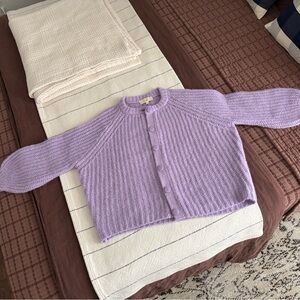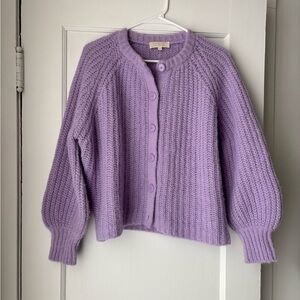 Sezane Emile cardigan in the rare colorway wisteria. Worn twice. This is a beautiful and soft sweater, but I haven't reached for it often enough to warrant holding onto. Chest measures approximately 25" and length from shoulder approximately 21." Alpaca, polyamide, and wool.