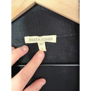 Keywords: Eileen Fisher, linen cardigan, black sweater, open front, drape neck, lightweight knit, womens size S, layering piece, minimalist, natural fibers, resort wear, casual chic, career, office, work