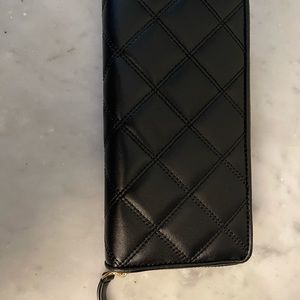 Elegant black quilted wallet. Features signature logo. Sleek and stylish design.