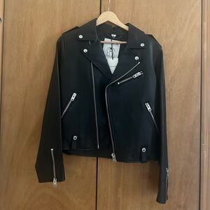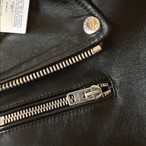 Coach Ladies Outerwear. Fashion category: Coats & Jackets. SKU: 6940 BLK. Color: Black. Coach Ladies Black Moto Zipper Biker Jacket Leather. A buttery soft leather moto jacket that exudes timeless style. This chic piece is adorned with a front zip fastening, classic lapels, and long sleeves for a classic yet contemporary look. The two side zip-fastening pockets not only add functionality but also contribute to the jackets edgy appeal. Enhanced with heavy-gauge zippers, signature snaps, and a timeless pointed collar, this jacket is a perfect blend of comfort and fashion-forward flair. 100% lamb leather.