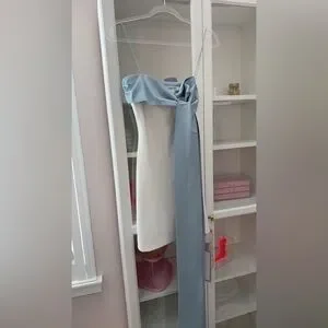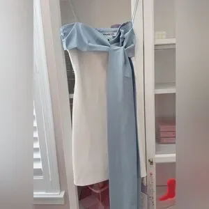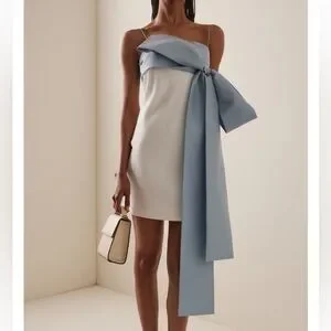 Beautiful white mini dress with statement blue bow and thin straps. Perfect for a bridal shower or chic bachelorette!