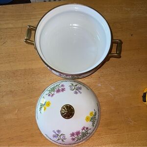 Vintage Lincoware enamelware Dutch oven with brass handles and a floral pattern