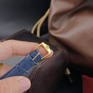 Stylish Gucci watch featuring a gold case. Blue textured strap. Minimalist dial design.
