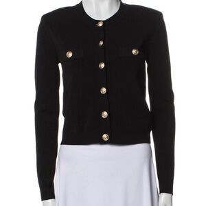 Ornate golden buttons adorn this close-fitting cardi by L'Agence trimmed with fine ribbing. Size Small and New without tags. Retail $475