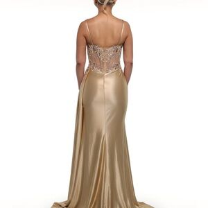 Dazzle in this exquisite strapless gold evening dress, perfect for glamorous events. The luxurious fabric and elegant design ensure you stand out. Wore once.