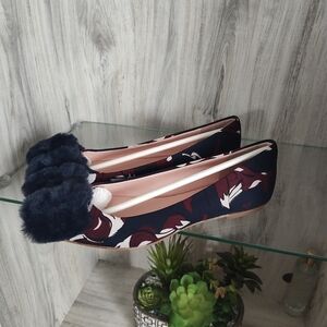 Stylish flats featuring a floral pattern and faux fur accent. Perfect for adding a touch of elegance to any outfit. defacing label to prevent return to the store