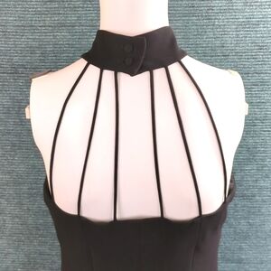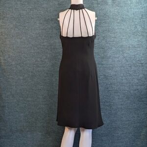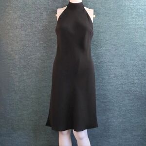 Very flattering cocktail dress by Evan Picone! Cut on the bias, so you can pull it on without a zipper. The hem flutters sweetly. Halter style with strappy back.