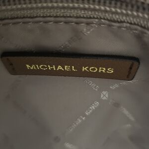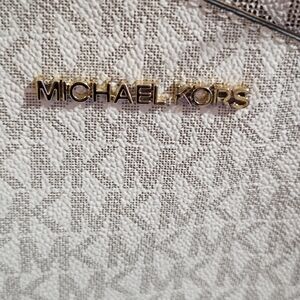 Stylish Michael Kors shoulder bag with cream and brown design. Features gold chain accents. Perfect for everyday use. Colors may slightly differ due to lighting.