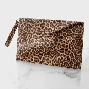 leopard print wine clutch bag perfect for any FUN occasion. Features a sleek design with a convenient wrist strap. Add a touch of wild elegance to your outfit and to the party!!