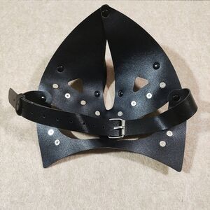 Embrace your mysterious side with this goth style black cat ear mask. It features faux leather material, silver spike accents and an adjustable back strap. Ideal for costume parties, role play, bdsm accessory or adding a playful touch to your ensemble.