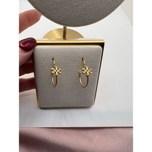 A pair of gold-toned Tory Burch hoop earrings is displayed on a light gray earring card. Each earring features a small, open-hoop design with a decorative Tory Burch logo charm suspended from the top. The charms are intricately cut out, revealing the brand's signature double-T emblem. The earrings appear to be in new condition with no visible signs of wear or imperfections.